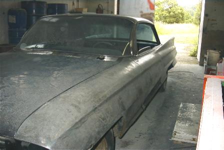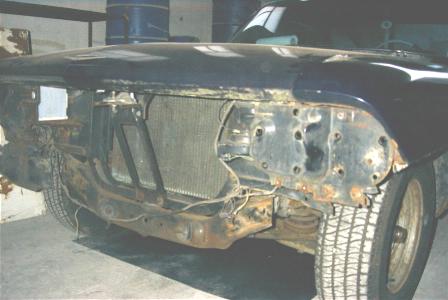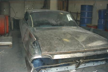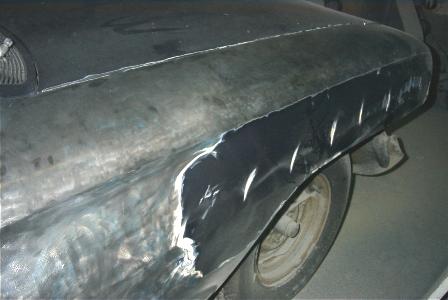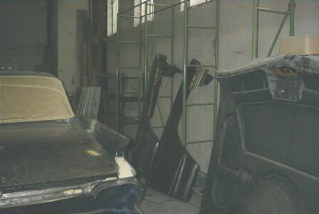 Hier sieht man noch den alten und neuen Kotflügel an der Wand stehen und die alte Motorhaube.