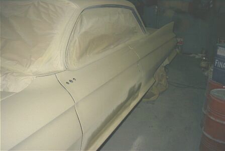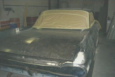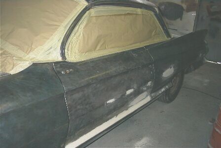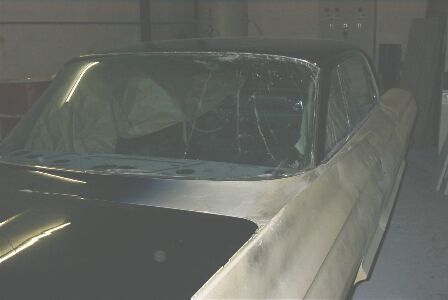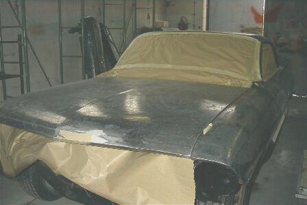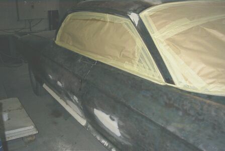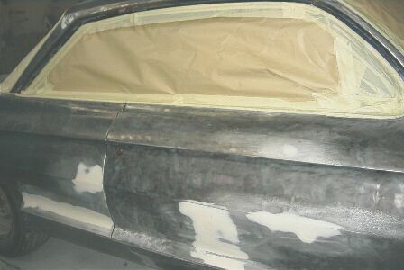 Auch der Rest ist grob vorgespachtelt, Rost entfernt, mit Fertan behandelt, und die Karosserie zum Grundieren abgeklebt.